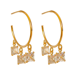 Brinco Argola Média com Pingente Ponto de Luz Quadrado Triplo Banhado a Ouro 18k