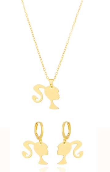 Colar 45cm com extensor de tamanho e brinco argolinha fechada com pingente da Barbie.